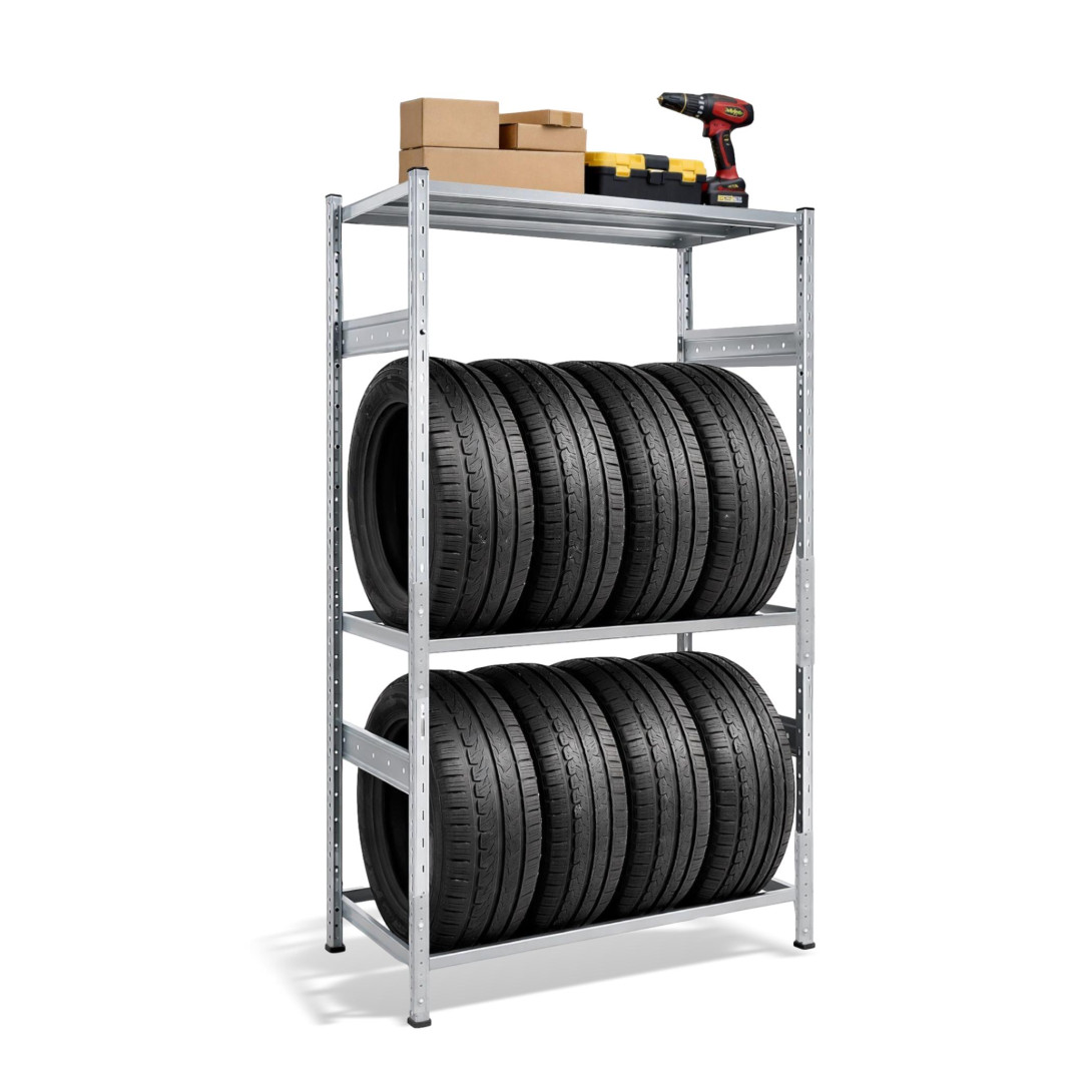 Konštrukcia regála je navrhnutá tak, aby spodná aj stredná časť slúžili priamo na uloženie pneumatík. Pevný rám ich spoľahlivo drží na mieste, takže sa neposúvajú a zostávajú stabilne uložené. V hornej časti sa nachádza praktická polica, ideálna na uloženie náradia, autodoplnkov, olejov, čistiacich prostriedkov alebo iného vybavenia do garáže.