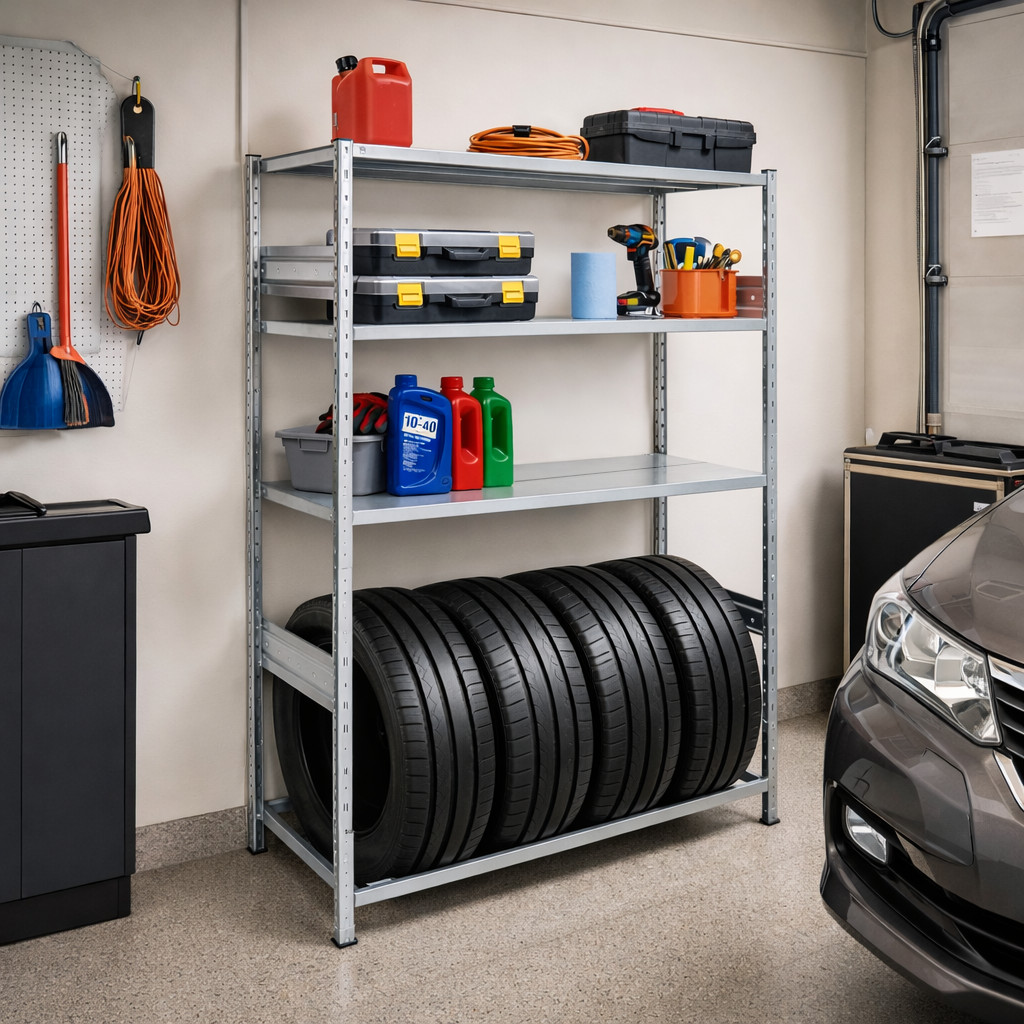 Pevná kovová konštrukcia zabezpečuje vysokú stabilitu – regál sa neprehýba a spoľahlivo drží aj pri väčšom zaťažení. Vďaka tomu je ideálny nielen do domácich garáží, ale aj do autoservisov, pneuservisov či dielní.