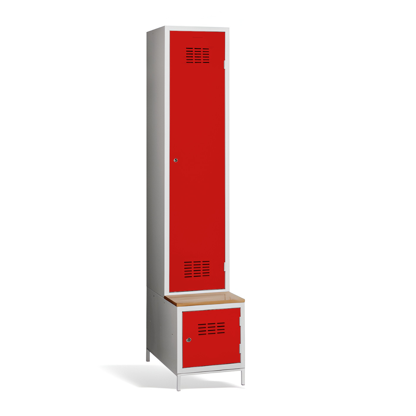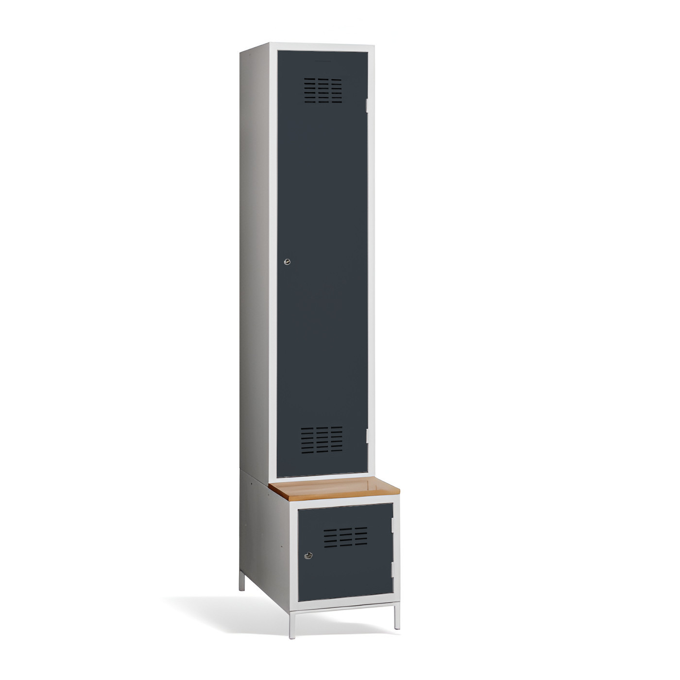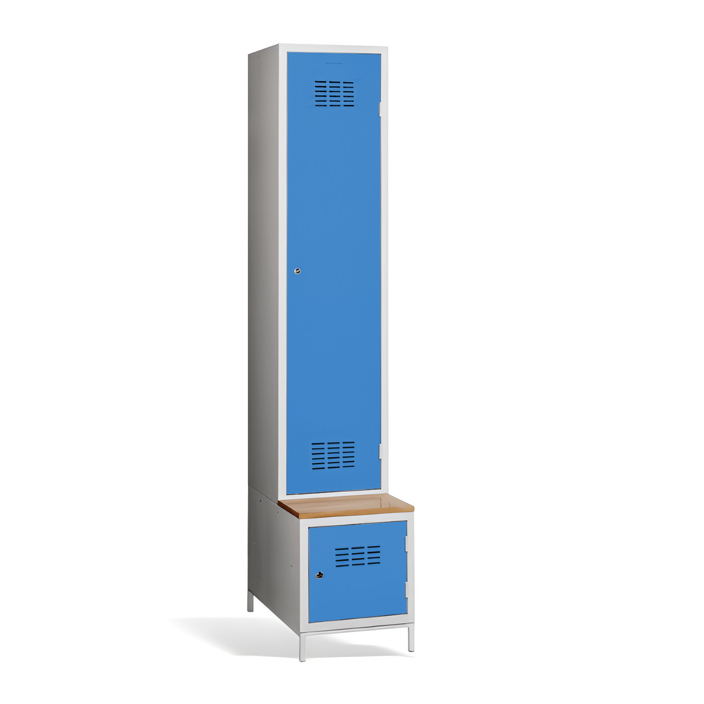 1-dverová šatníková skriňa #03 MAXI 1 PLUS s deliacou prepážkou, so zabudovanou lavicou a skrinkou na obuv je ideálnym riešením do šatne. Ide o najpohodlnejšie riešenie, ktoré zabezpečí pohodlie a poriadok v šatni. Vďaka prepážke ju môžete využiť aj na oddelenie pracovného a civilného oblečenia v jednej skrini. Kovová skriňa v svetlosivej farbe má zváranú konštrukciu, je vyrobená z kvalitného oceľového plechu 1. triedy s povrchovou úpravou. Skriňa ponúka dostatočný priestor, pohodlne si do nej uložíte oblečenie, doplnky a iné osobné predmety. Vetracie otvory v hornej a dolnej časti dverí zabezpečujú efektívne prúdenie vzduchu. #03 MAXI 1 PLUS štandardne dodávame s bezpečnostným cylindrickým zámkom, ale môžete si vybrať z rôznych typov zámkov podľa vlastného želania.