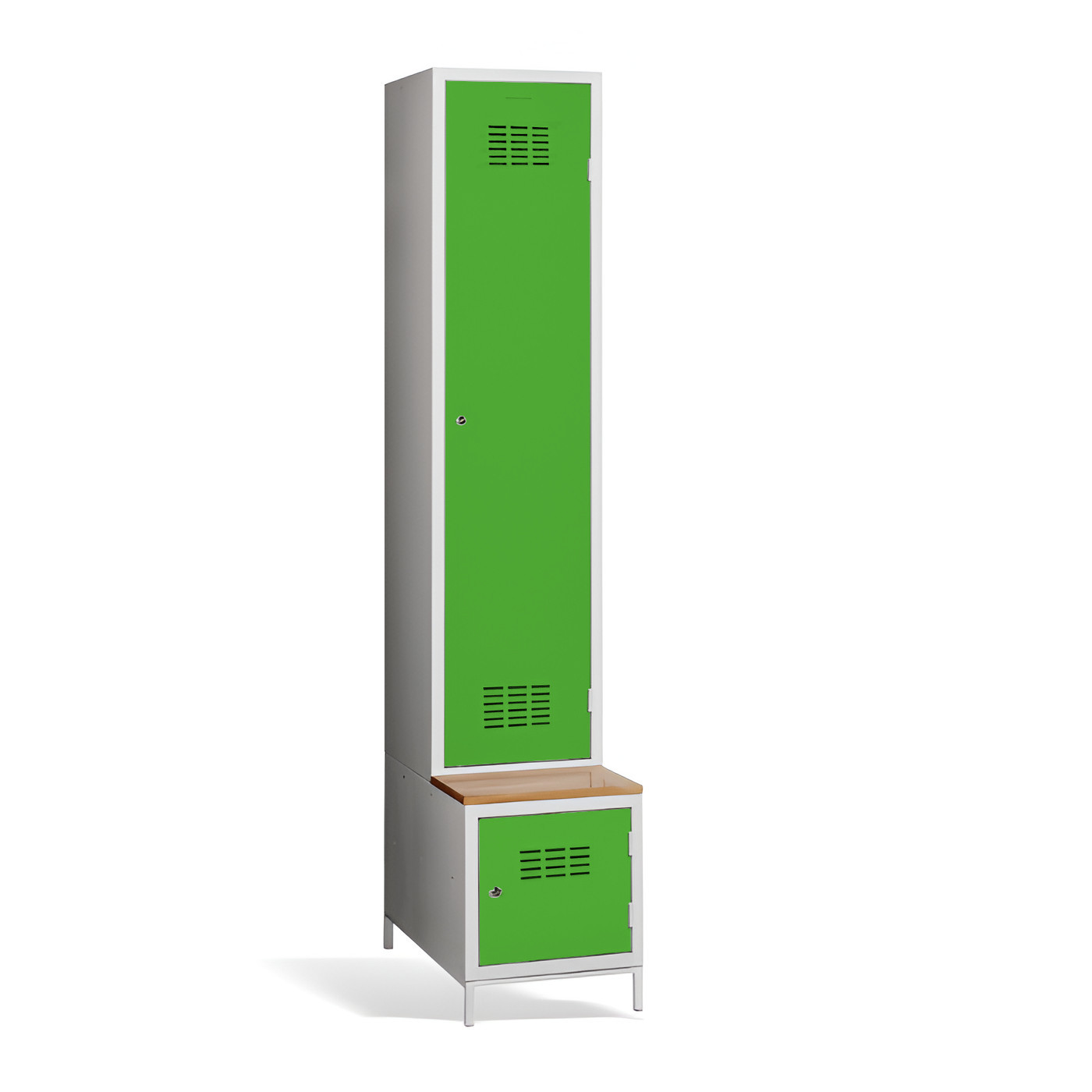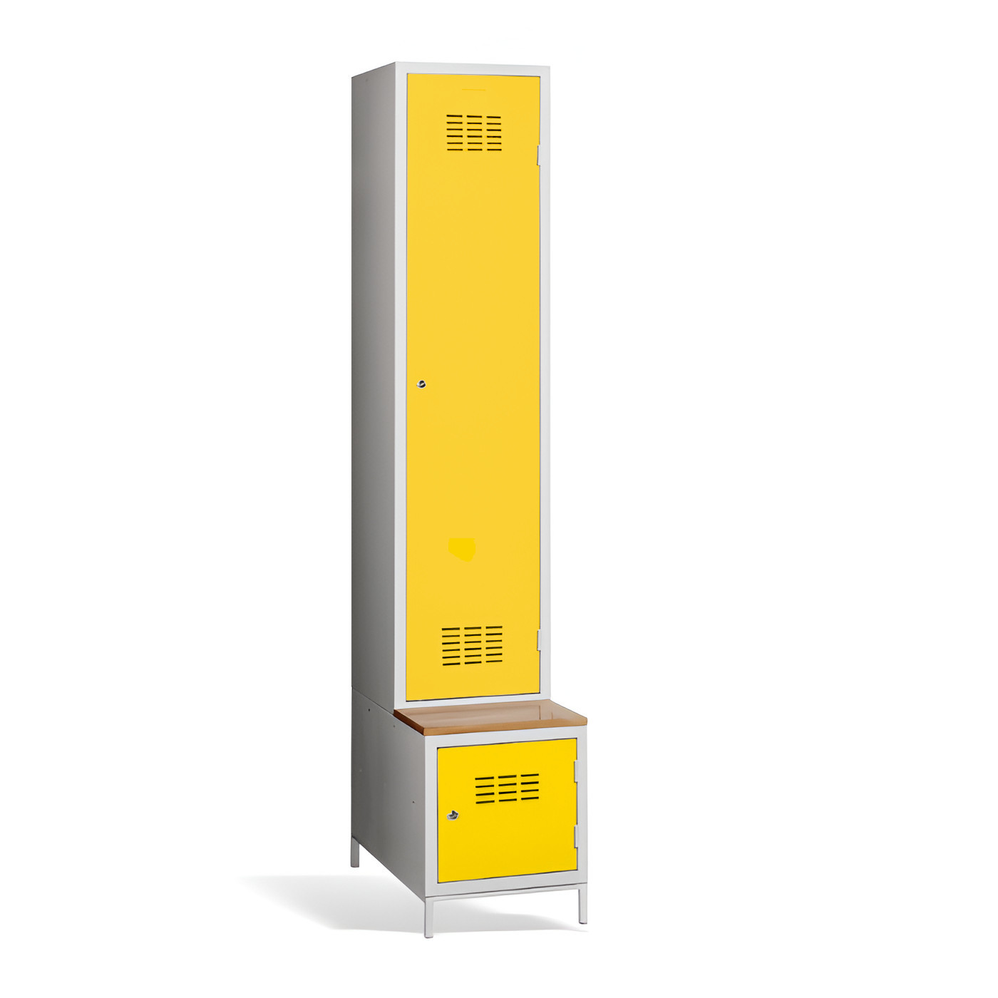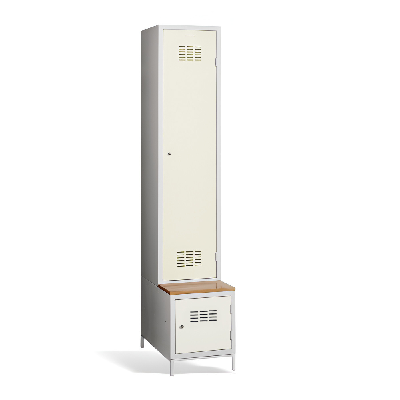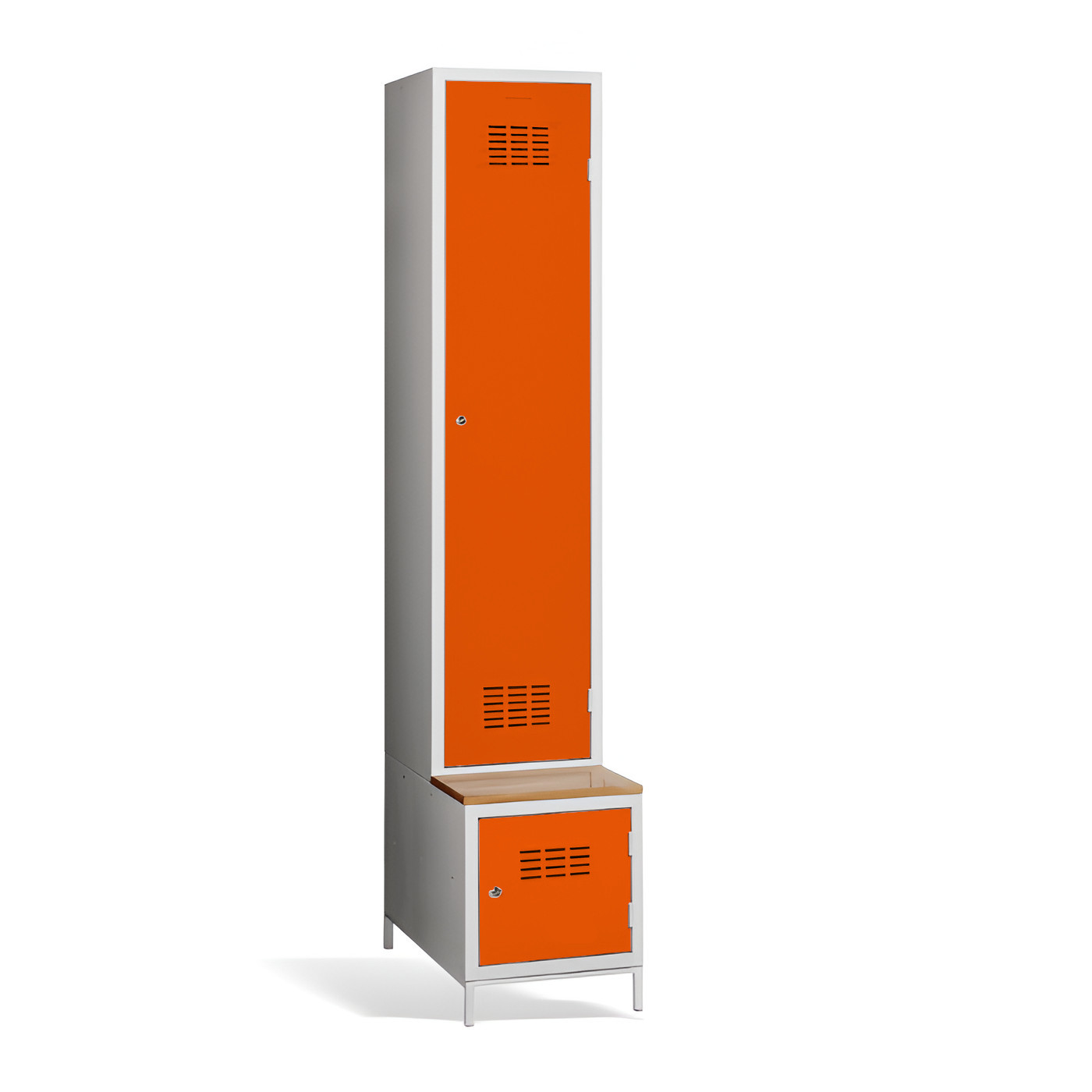 1-dverová šatníková skriňa #03 MAXI 1 PLUS s deliacou prepážkou, so zabudovanou lavicou a skrinkou na obuv je ideálnym riešením do šatne. Ide o najpohodlnejšie riešenie, ktoré zabezpečí pohodlie a poriadok v šatni. Vďaka prepážke ju môžete využiť aj na oddelenie pracovného a civilného oblečenia v jednej skrini. Kovová skriňa v svetlosivej farbe má zváranú konštrukciu, je vyrobená z kvalitného oceľového plechu 1. triedy s povrchovou úpravou. Skriňa ponúka dostatočný priestor, pohodlne si do nej uložíte oblečenie, doplnky a iné osobné predmety. Vetracie otvory v hornej a dolnej časti dverí zabezpečujú efektívne prúdenie vzduchu. #03 MAXI 1 PLUS štandardne dodávame s bezpečnostným cylindrickým zámkom, ale môžete si vybrať z rôznych typov zámkov podľa vlastného želania.