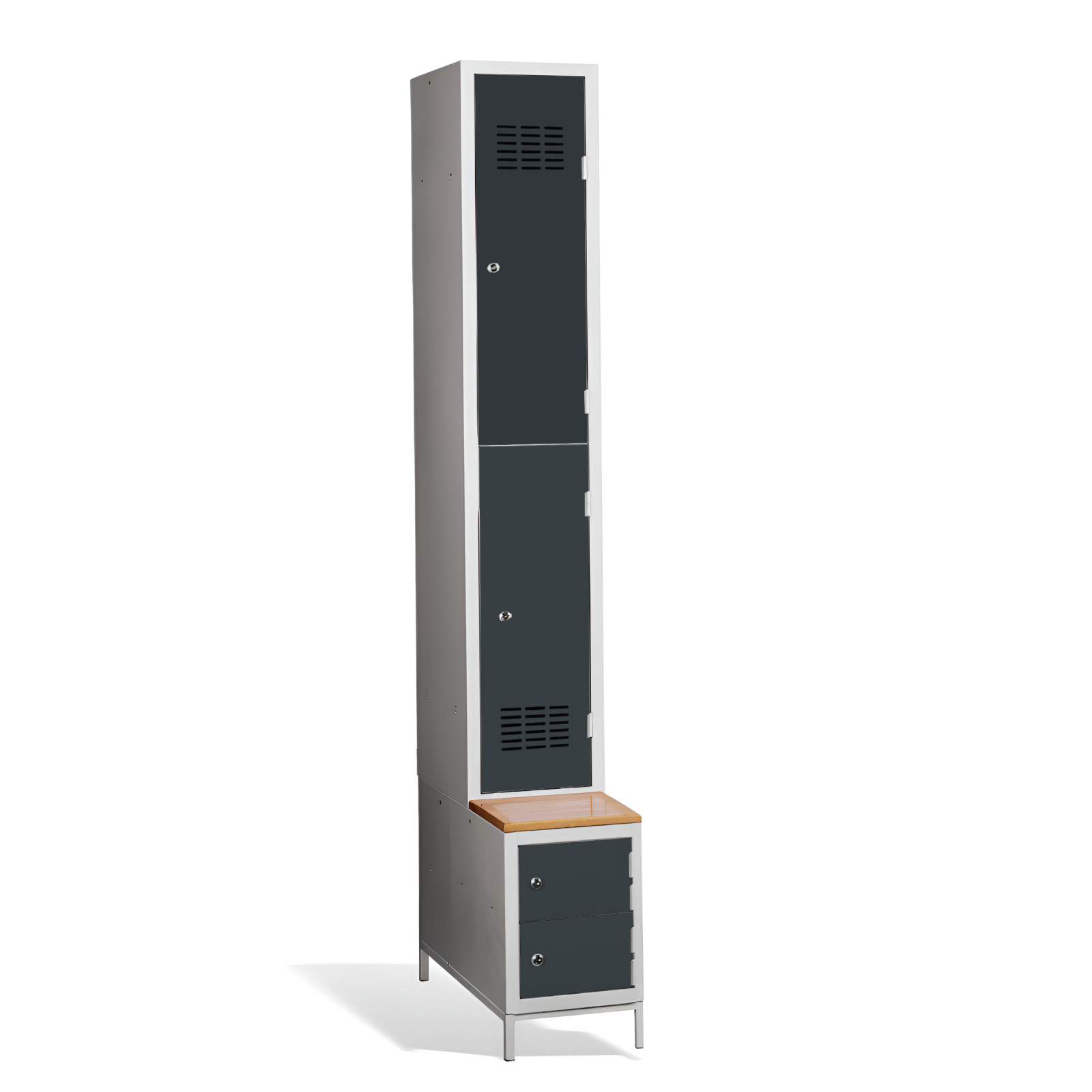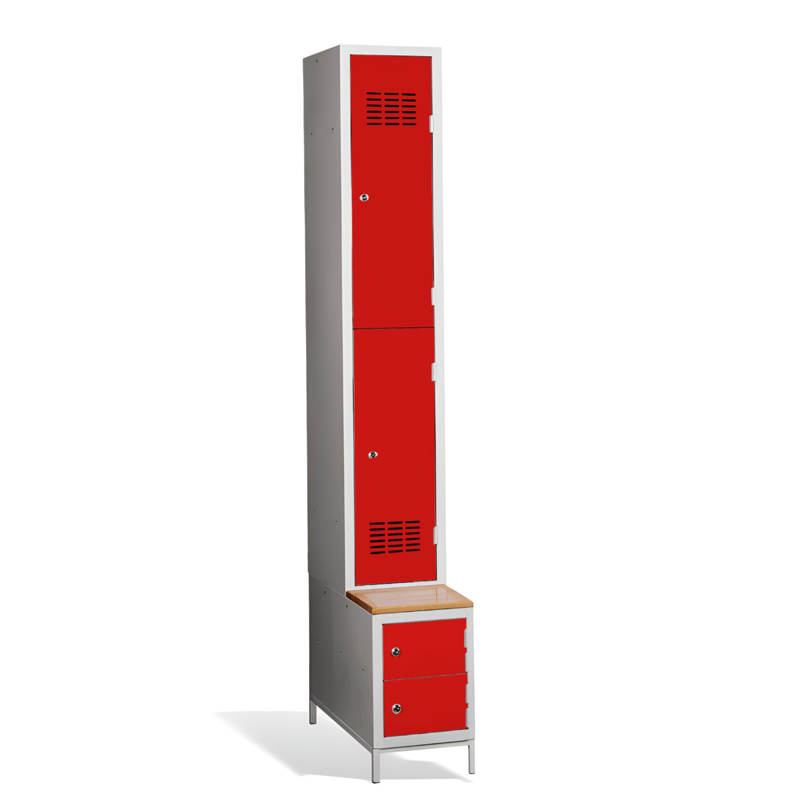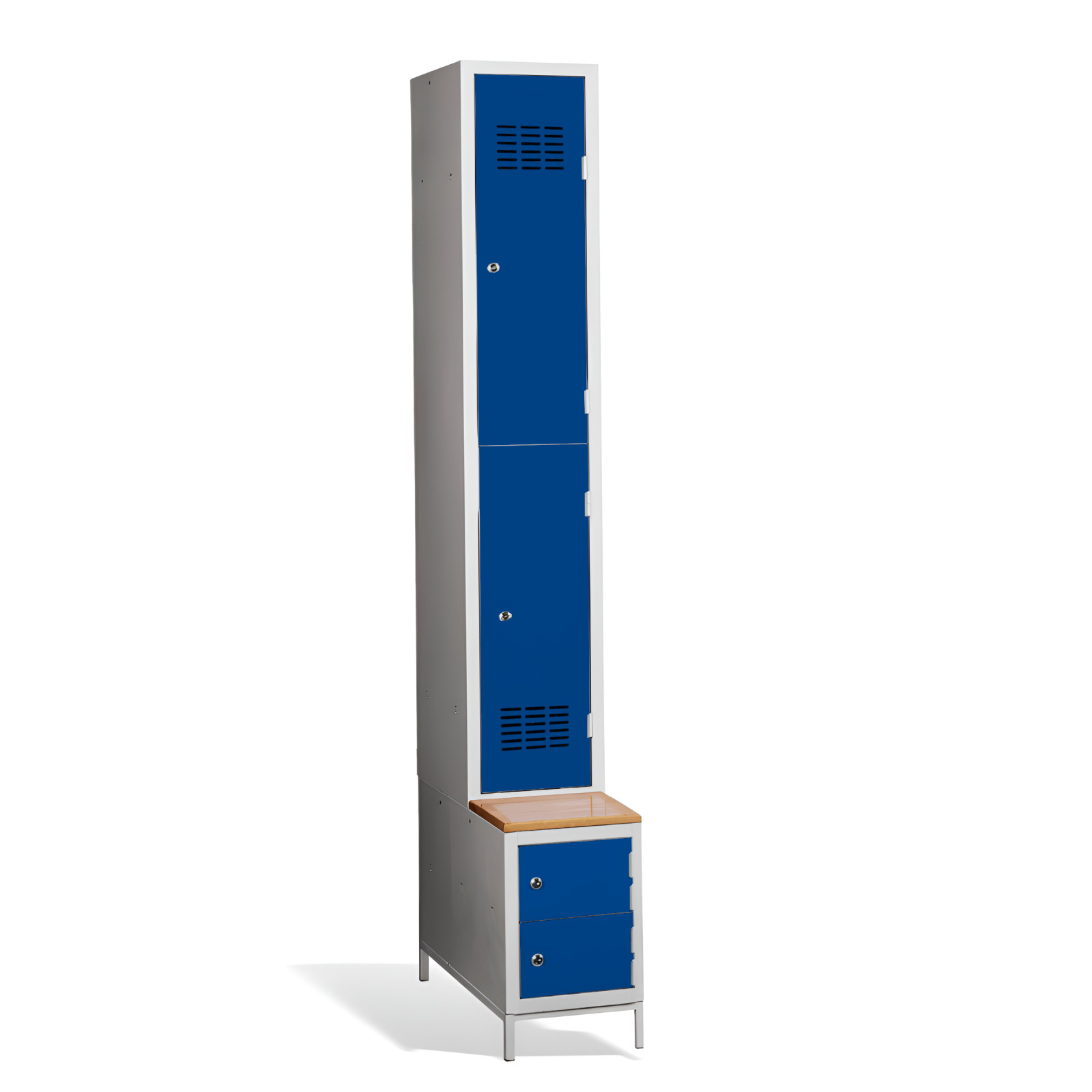 Ak hľadáte komplexné riešenie do vašej šatne, #03 MINI 2 PLUS je perfektnou voľbou pre Vás! 2-dverová šatňová skriňa s krátkymi dverami ponúka dostatok úložného priestoru pre 2 ľudí: obsahuje zabudovanú lavicu a skrinku na obuv pre väčší komfort a poriadok. Konštrukcia šatníkovej skrine je zváraná, vyrobená z kvalitného oceľového plechu 1. triedy s povrchovou úpravou. #03 MINI 2 PLUS štandardne dodávame s bezpečnostným cylindrickým zámkom, ale môžete si vybrať z rôznych typov zámkov podľa vlastného želania.