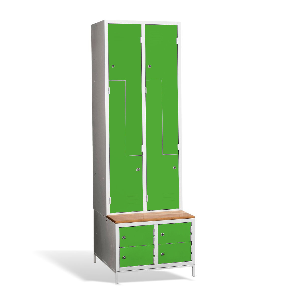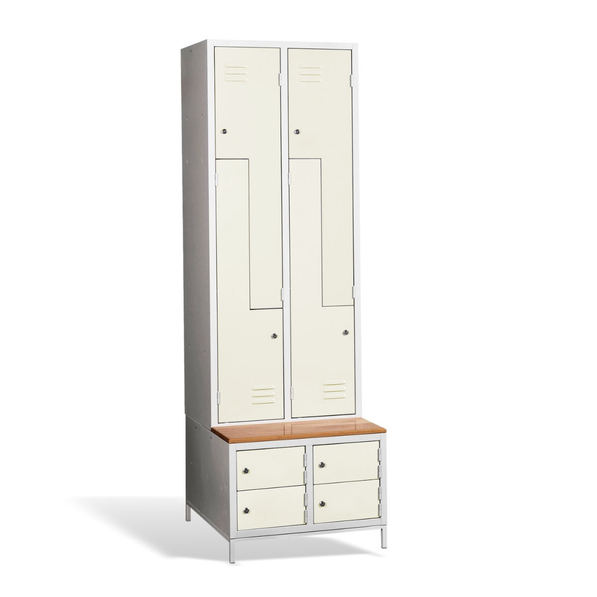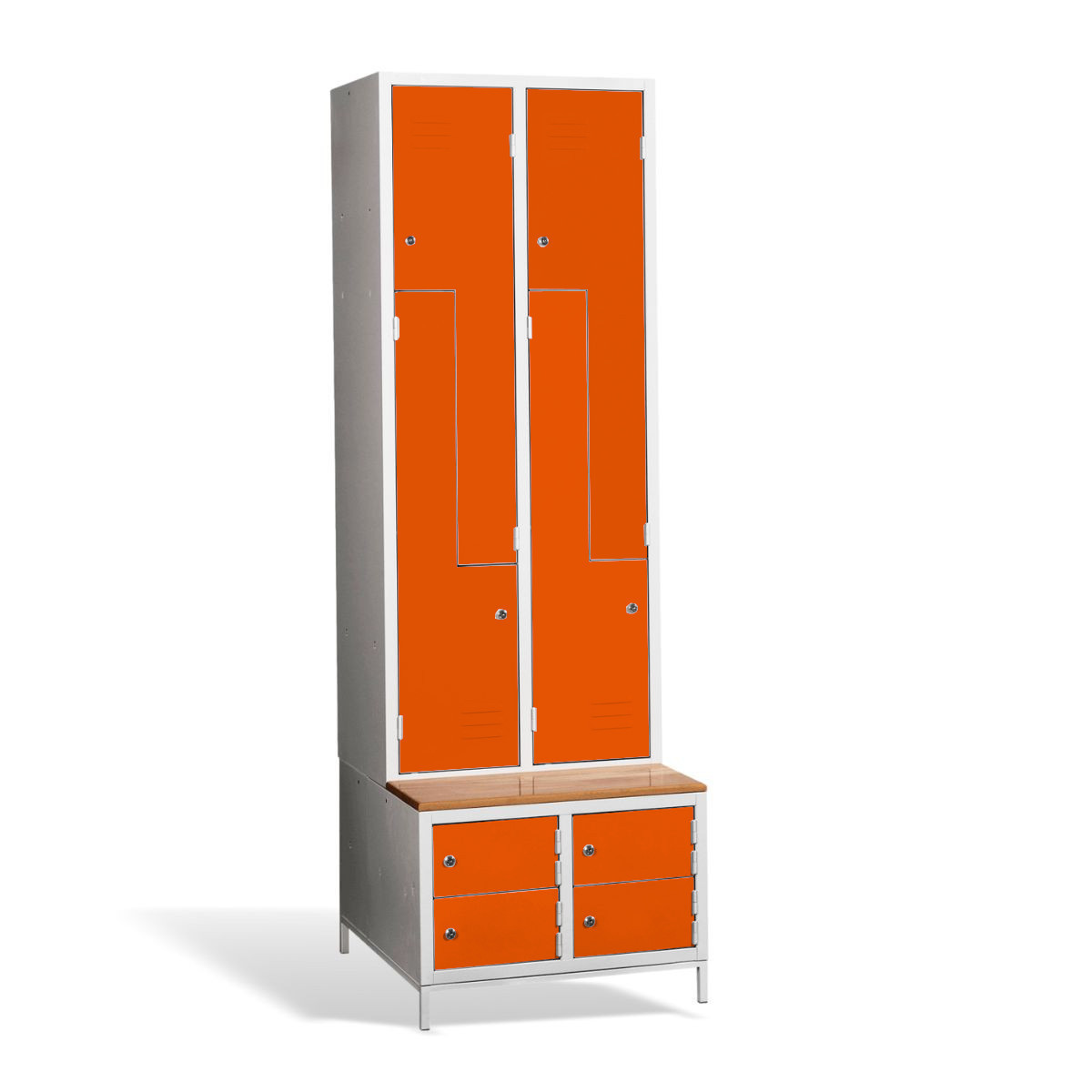 Kovová šatníková skriňa #03 CIK-CAK MINI 4 PLUS ponúka riešenie 3 v 1. Obsahuje úložný priestor pre Vaše osobné veci a kabáty vo forme 4 priehradiek, je vybavená zabudovanou lavicou pre vaše pohodlie, pod ktorou nájdete aj skrinky na obuv pre väčší komfort a čistotu. Konštrukcia šatníkovej skrine je zváraná, vyrobená z kvalitného oceľového plechu 1. triedy s povrchovou úpravou. Z-kové prevedenie šatňovej skrinky je priestorovo úsporné, napriek tomu poskytuje dostatočný komfort. Táto skriňa je ideálnou voľbou do šatne v škole, firme či športovom zariadení. #03 CIK-CAK MINI 4 PLUS štandardne dodávame s bezpečnostným cylindrickým zámkom, ale môžete si vybrať z rôznych typov zámkov podľa vlastného želania.