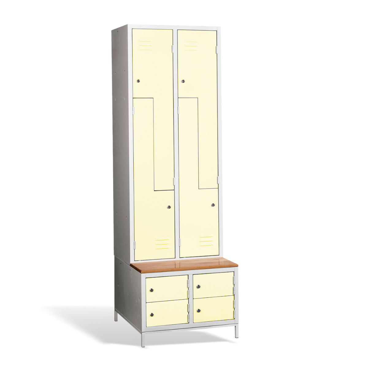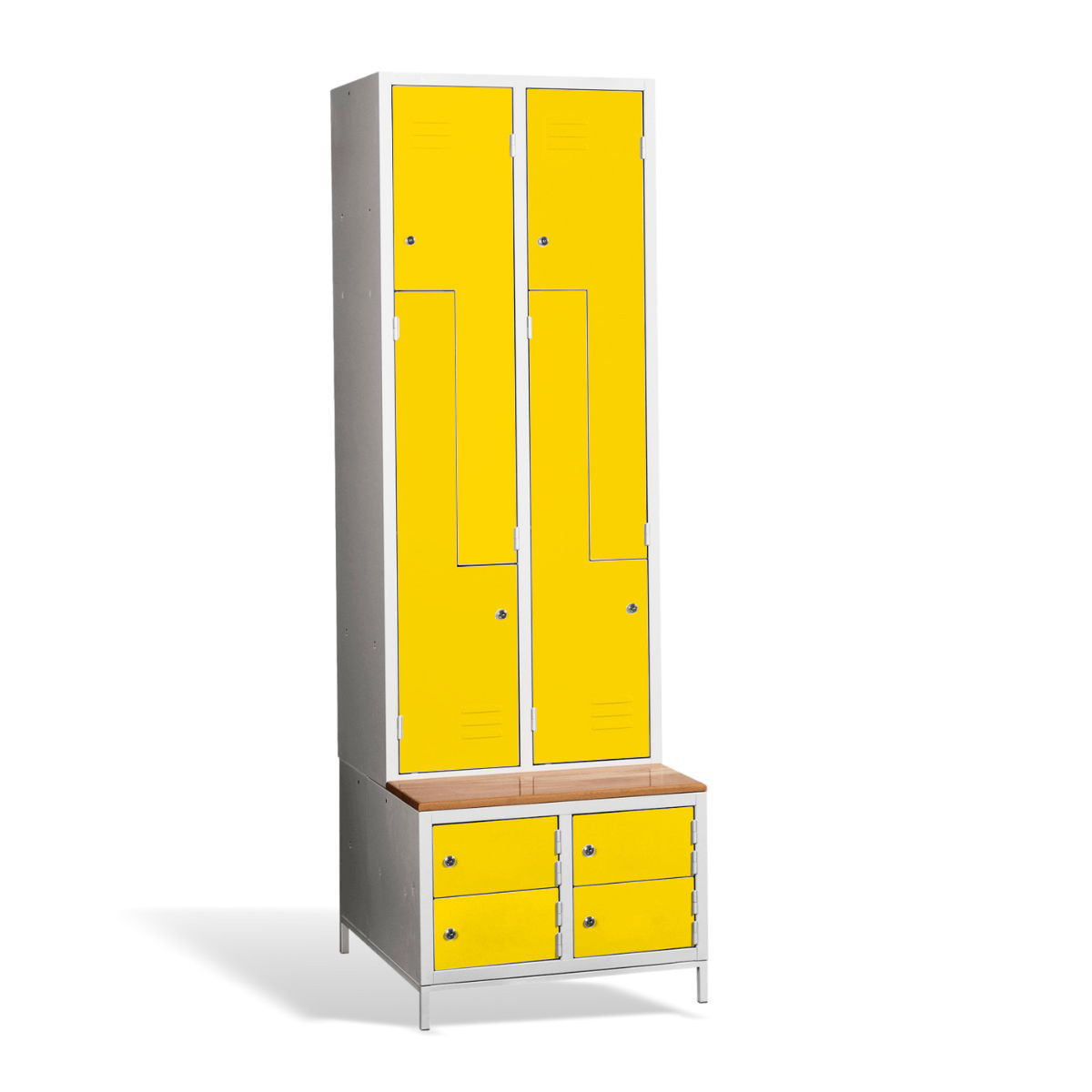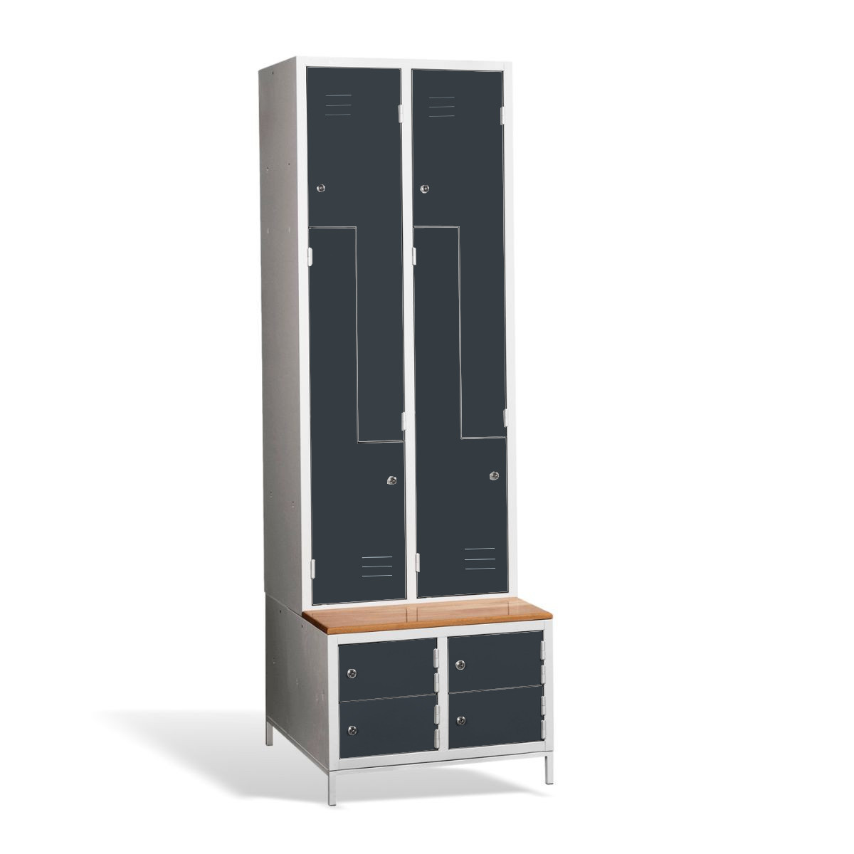 Kovová šatníková skriňa #03 CIK-CAK MINI 4 PLUS ponúka riešenie 3 v 1. Obsahuje úložný priestor pre Vaše osobné veci a kabáty vo forme 4 priehradiek, je vybavená zabudovanou lavicou pre vaše pohodlie, pod ktorou nájdete aj skrinky na obuv pre väčší komfort a čistotu. Konštrukcia šatníkovej skrine je zváraná, vyrobená z kvalitného oceľového plechu 1. triedy s povrchovou úpravou. Z-kové prevedenie šatňovej skrinky je priestorovo úsporné, napriek tomu poskytuje dostatočný komfort. Táto skriňa je ideálnou voľbou do šatne v škole, firme či športovom zariadení. #03 CIK-CAK MINI 4 PLUS štandardne dodávame s bezpečnostným cylindrickým zámkom, ale môžete si vybrať z rôznych typov zámkov podľa vlastného želania.