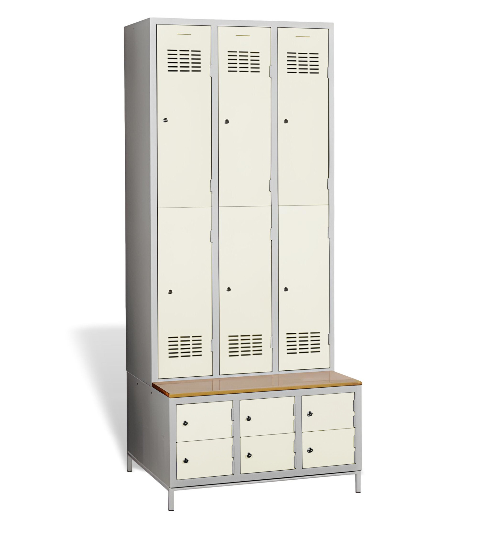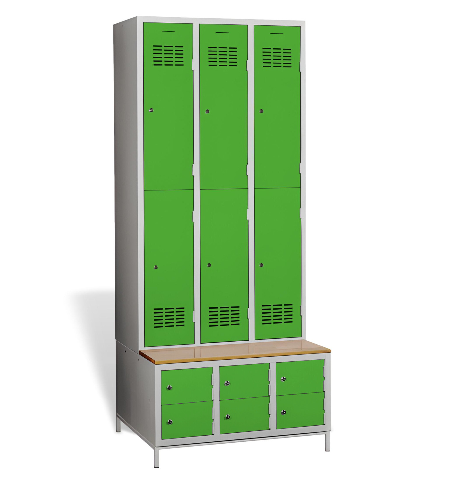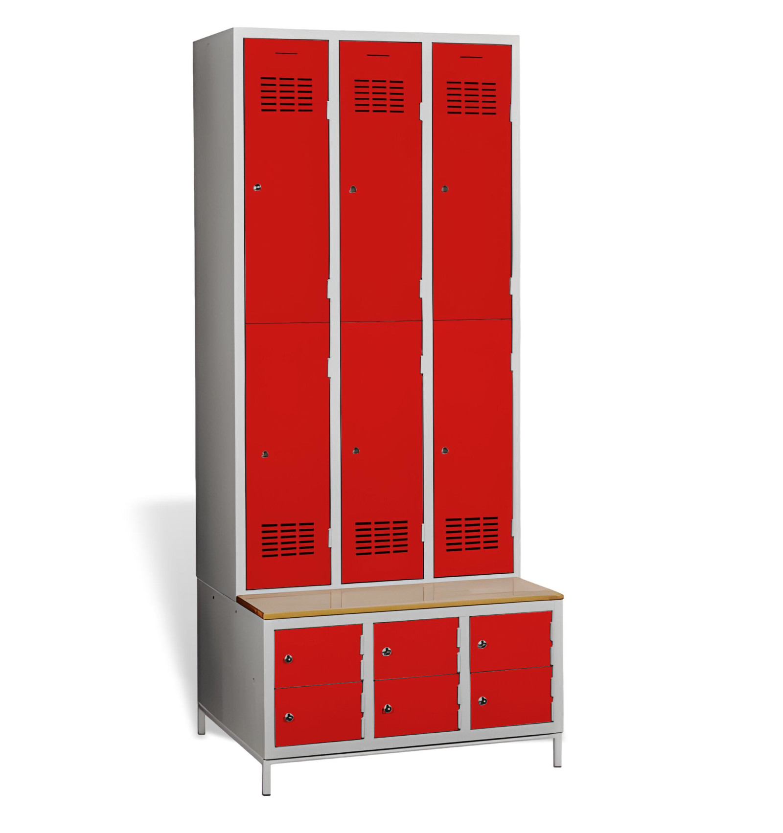 6-dverová šatňová skriňa je perfektnou voľbou do každej šatne, pretože ponúka all-inclusive riešenie. Má krátke dvierka, vďaka čomu poskytuje samostatný úložný priestor pre 6 osôb, pričom vďaka svojej šírke 900 mm zaberá len málo miesta. Obsahuje zabudovanú lavicu pre väčší komfort pri prezliekaní, a skriňu na obuv pre čistotu a poriadok. Konštrukcia šatníkovej skrine je zváraná, vyrobená z kvalitného oceľového plechu 1. triedy s povrchovou úpravou. #03 MINI 6 PLUS štandardne dodávame s bezpečnostným cylindrickým zámkom, ale môžete si vybrať z rôznych typov zámkov podľa vlastného želania.
