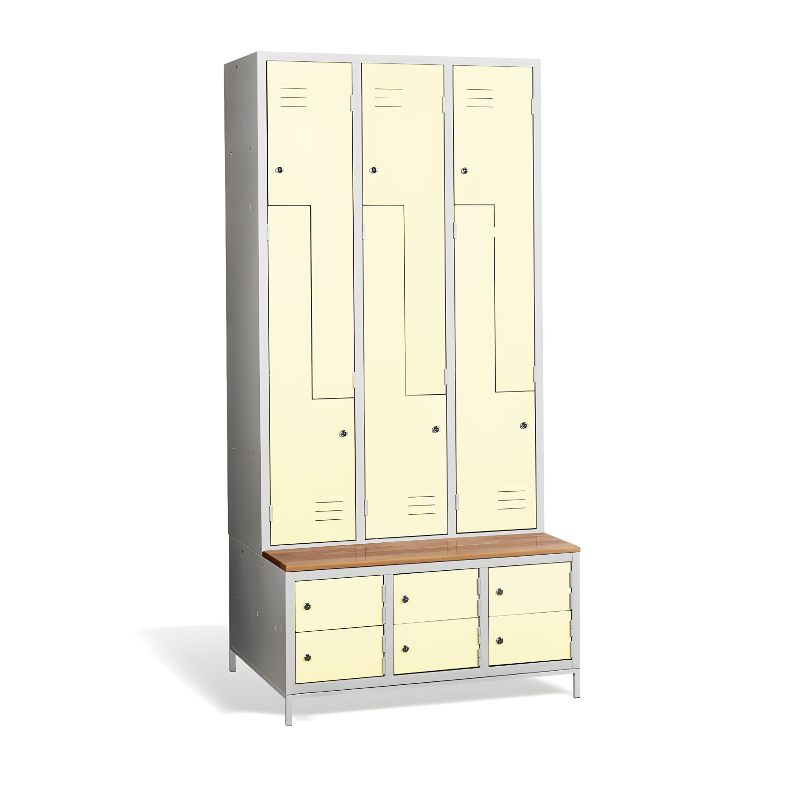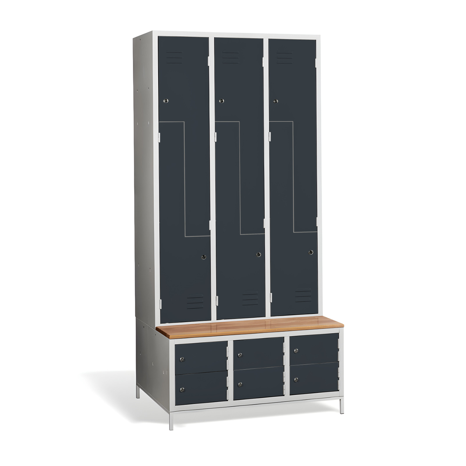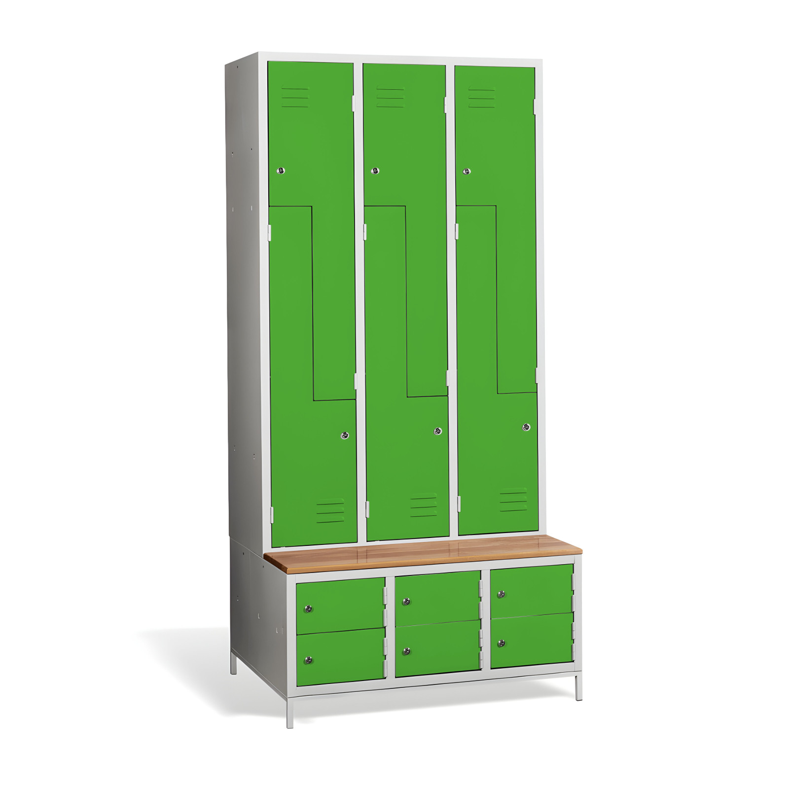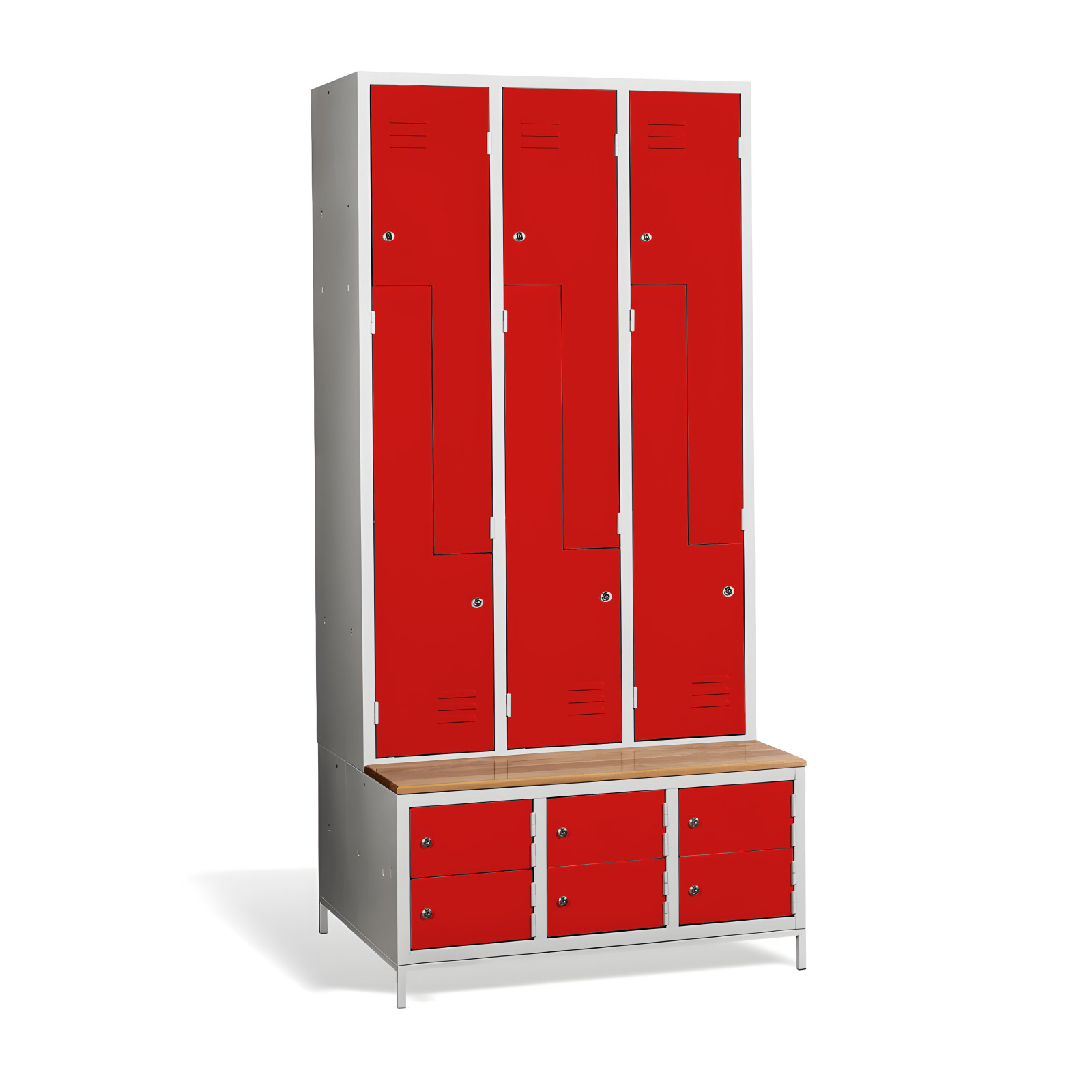 Kovová šatníková skriňa #03 CIK-CAK MINI 6 PLUS ponúka riešenie 3 v 1. Obsahuje úložný priestor pre Vaše osobné veci a kabáty vo forme 6 priehradiek, ponúka priestor pre Vaše topánky so skrinkami na obuv, a je vybavená zabudovanou lavicou pre vaše pohodlie. Konštrukcia šatníkovej skrine je zváraná, vyrobená z kvalitného oceľového plechu 1. triedy s povrchovou úpravou. Z-kové prevedenie šatňovej skrinky je priestorovo úsporné, napriek tomu poskytuje dostatočný komfort. Táto skriňa je ideálnou voľbou do šatne v škole, firme či športovom zariadení. #03 CIK-CAK MINI 6 PLUS štandardne dodávame s bezpečnostným cylindrickým zámkom, ale môžete si vybrať z rôznych typov zámkov podľa vlastného želania.