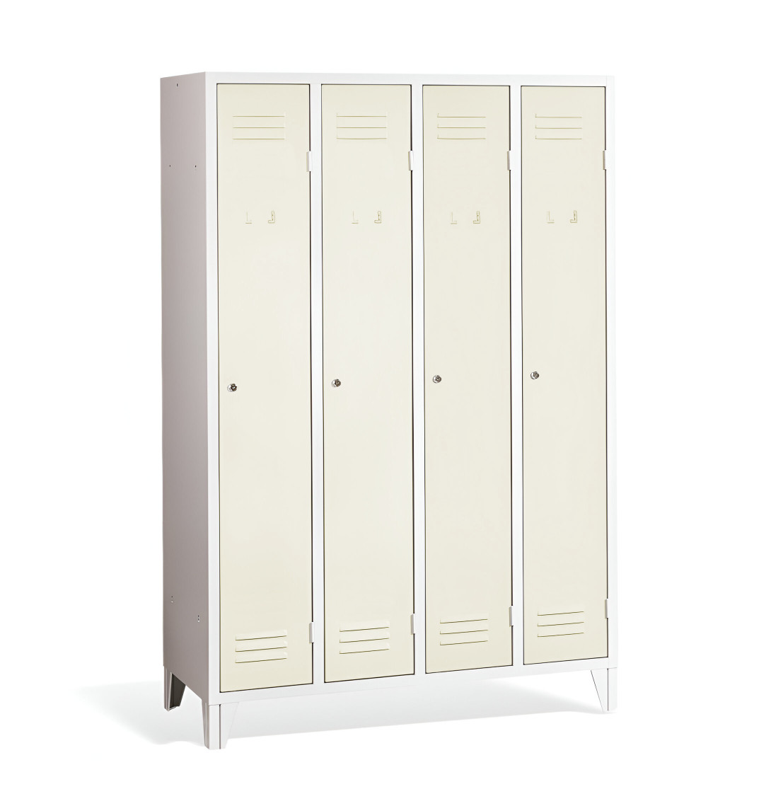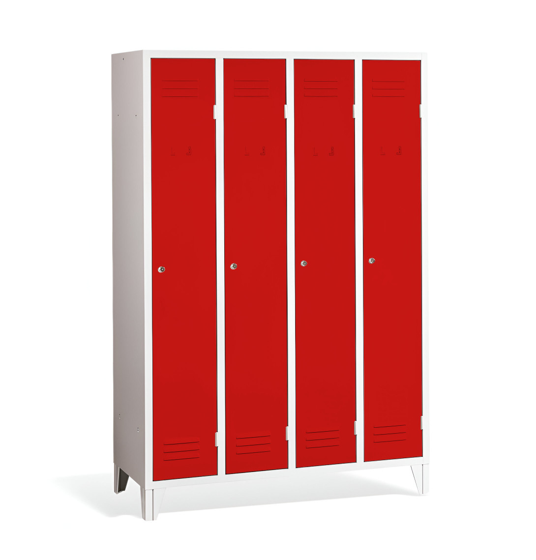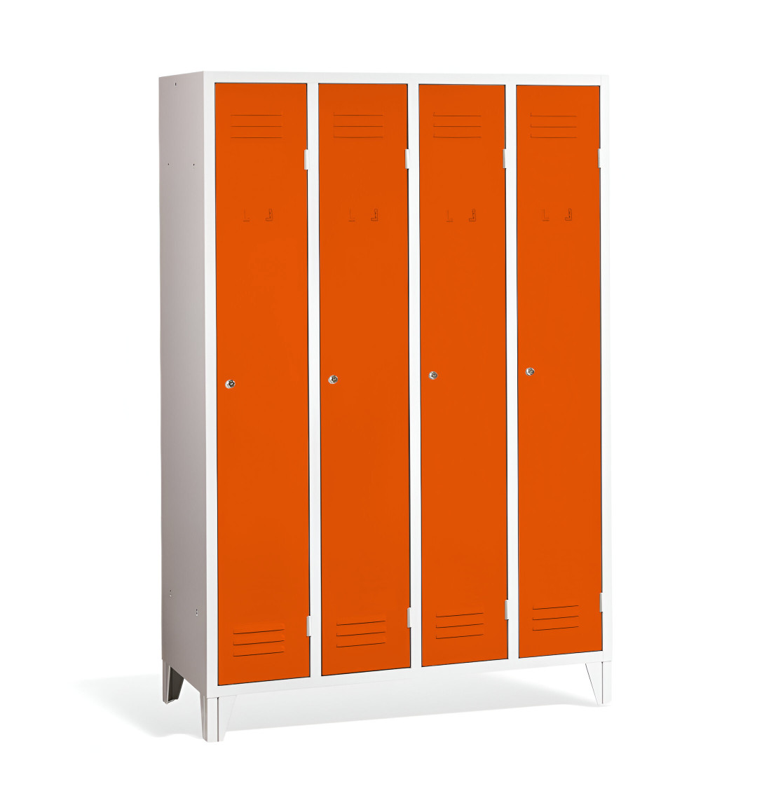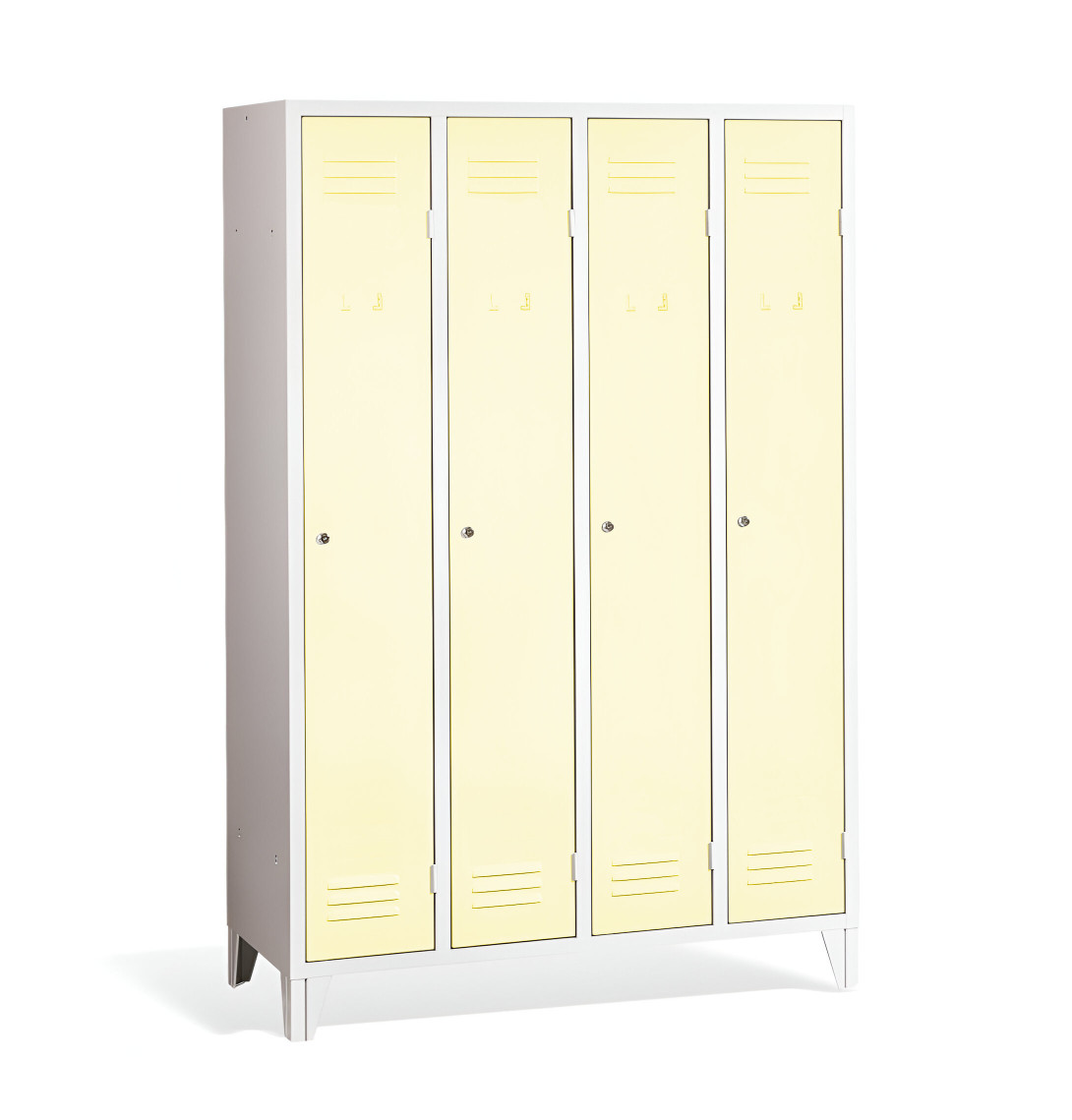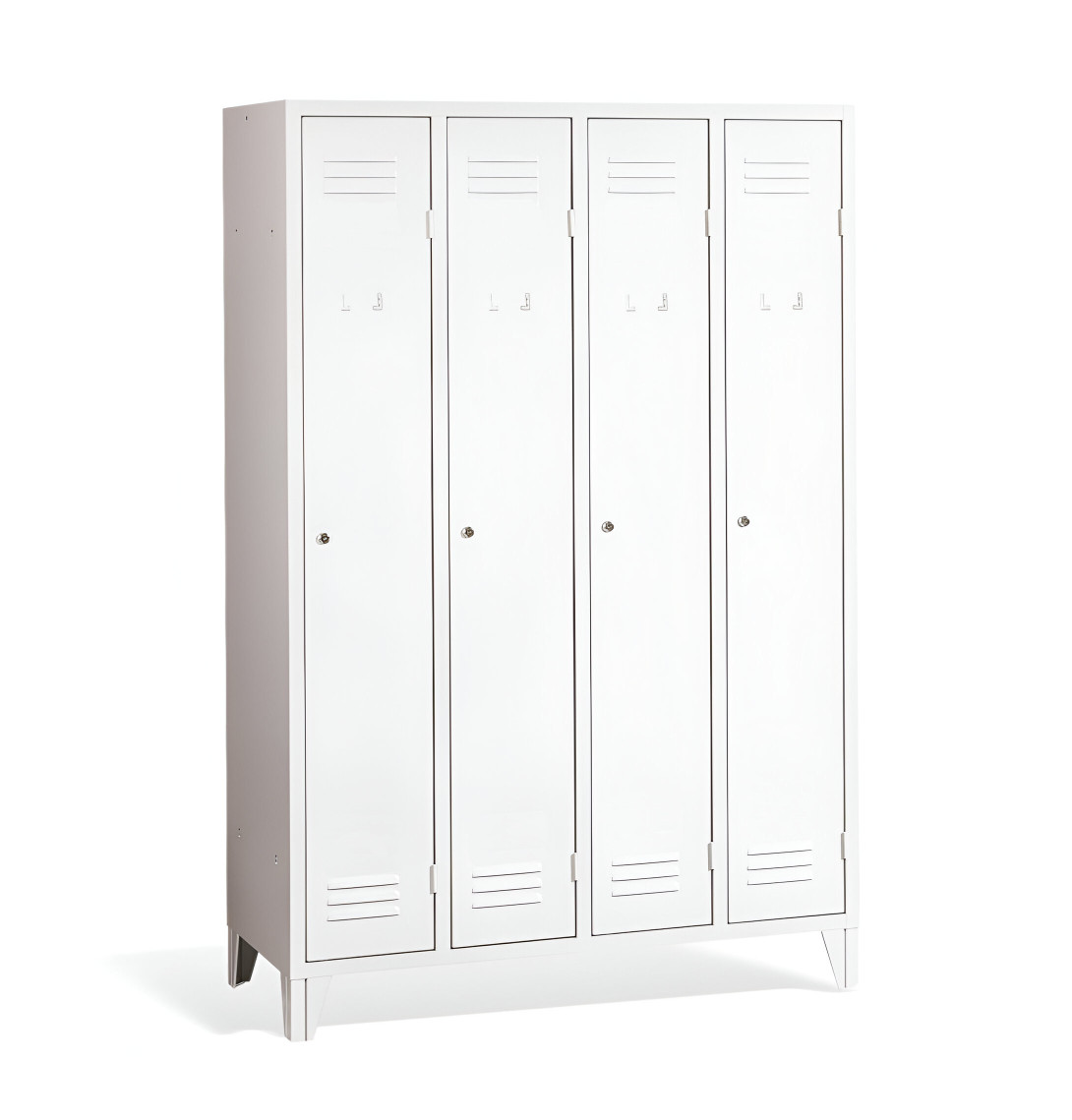 4-dverová šatňová skriňa s nožičkami #26 STANDARD 2 ECONOMY F je cenovo dostupným riešením pre školy, firmy aj iné inštitúcie. Má dlhé dvierka, vďaka čomu poskytuje dostatočné miesto pre Vaše kabáty, topánky aj osobné predmety. Je vyrobená z kvalitného oceľového plechu 1. triedy s povrchovou úpravou, čo zabezpečuje jej dlhú životnosť. Vetracie otvory v hornej aj dolnej časti dverí zabezpečujú efektívne prúdenie vzduchu a odvádzajú pach. Nožičky majú výšku 120 mm, čo umožňuje pohodlné upratovanie pod skrinkami. Štandardne ju dodávame s bezpečnostným cylindrickým zámkom, ale môžete si vybrať z rôznych typov zámkov podľa vlastného želania.