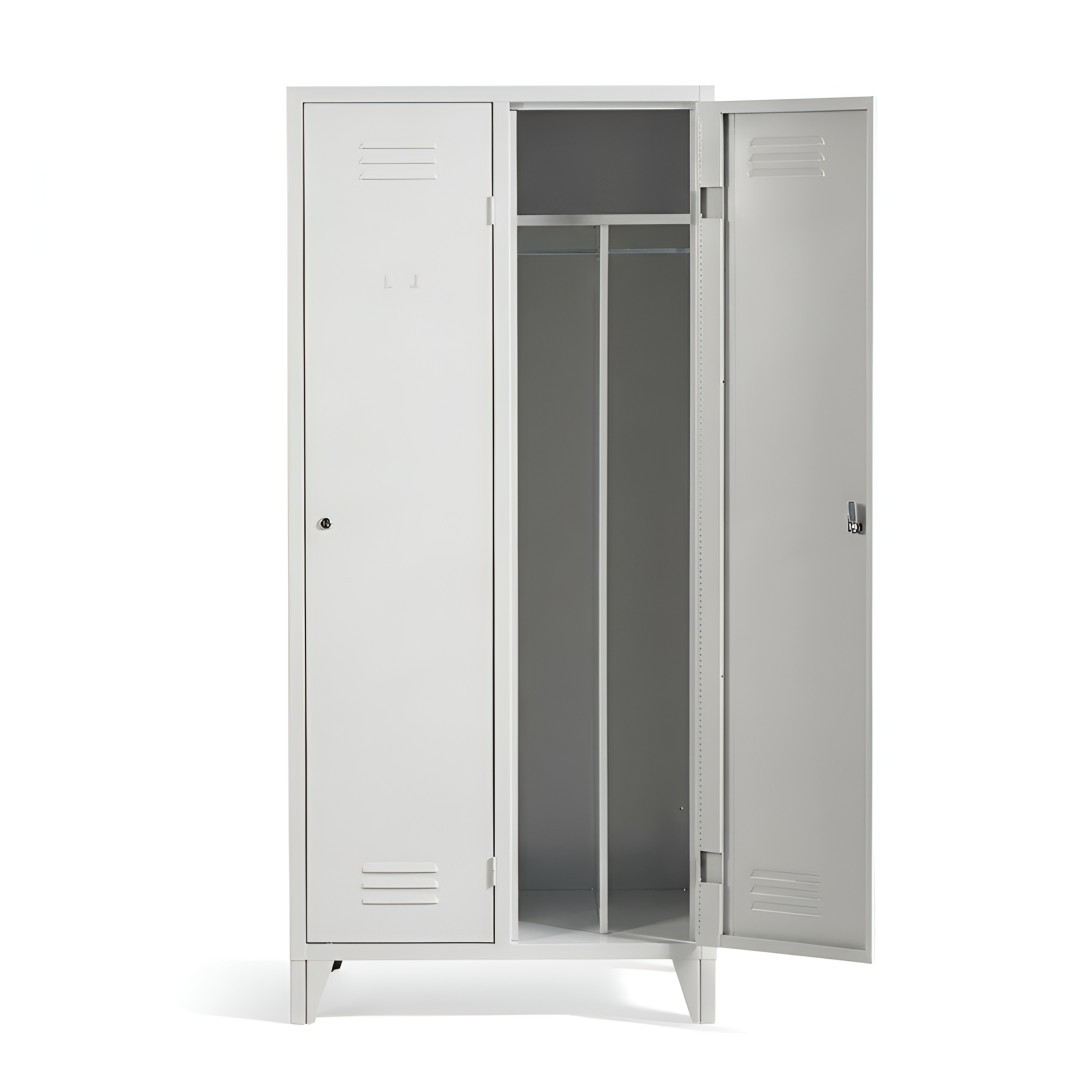 Skriňa je rozdelená na dve samostatné priehradky. Každá priehradka obsahuje deliacu priečku, ktorá umožňuje oddeliť pracovné a čisté oblečenie, čím pomáha udržiavať lepší poriadok a hygienu pri ukladaní odevov.