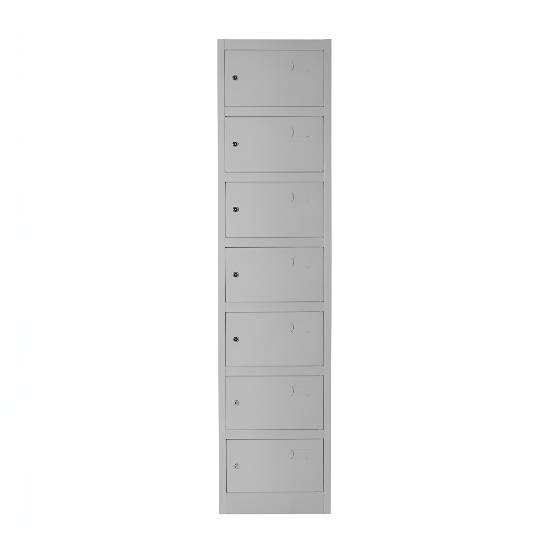 Skriňa je vybavená 7 samostatnými priehradkami, ktoré umožňujú oddelené uloženie osobných vecí viacerých používateľov. Takéto riešenie je praktické najmä tam, kde je potrebné zabezpečiť prehľadný a bezpečný systém odkladania drobných predmetov a cenností.