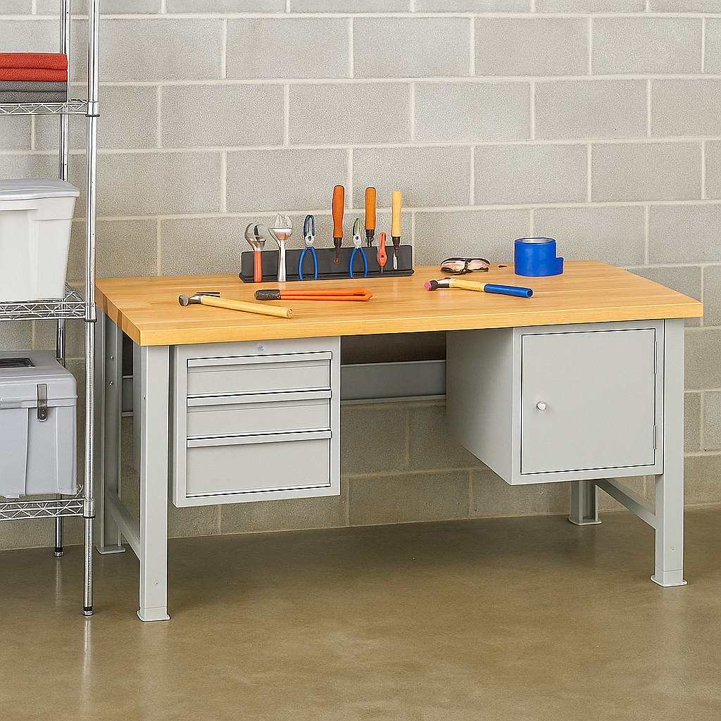 Stôl je vybavený praktickou 3-zásuvkovou skrinkou a 1-dverovou skrinkou s dvomi vnútornými policami, vyrobenými z kvalitného oceľového plechu hrúbky 0,7–0,8 mm. Zásuvky s nosnosťou 40 kg sú plne výsuvné na guličkových ložiskách, pripravené na použitie deliacich priečok a uzamykateľné cylindrickým zámkom, vďaka čomu ponúkajú bezpečné uloženie náradia a príslušenstva. Jednodverová skrinka poskytuje ďalší úložný priestor pre väčšie predmety, čím pomáha udržať pracovisko čisté a prehľadné.
