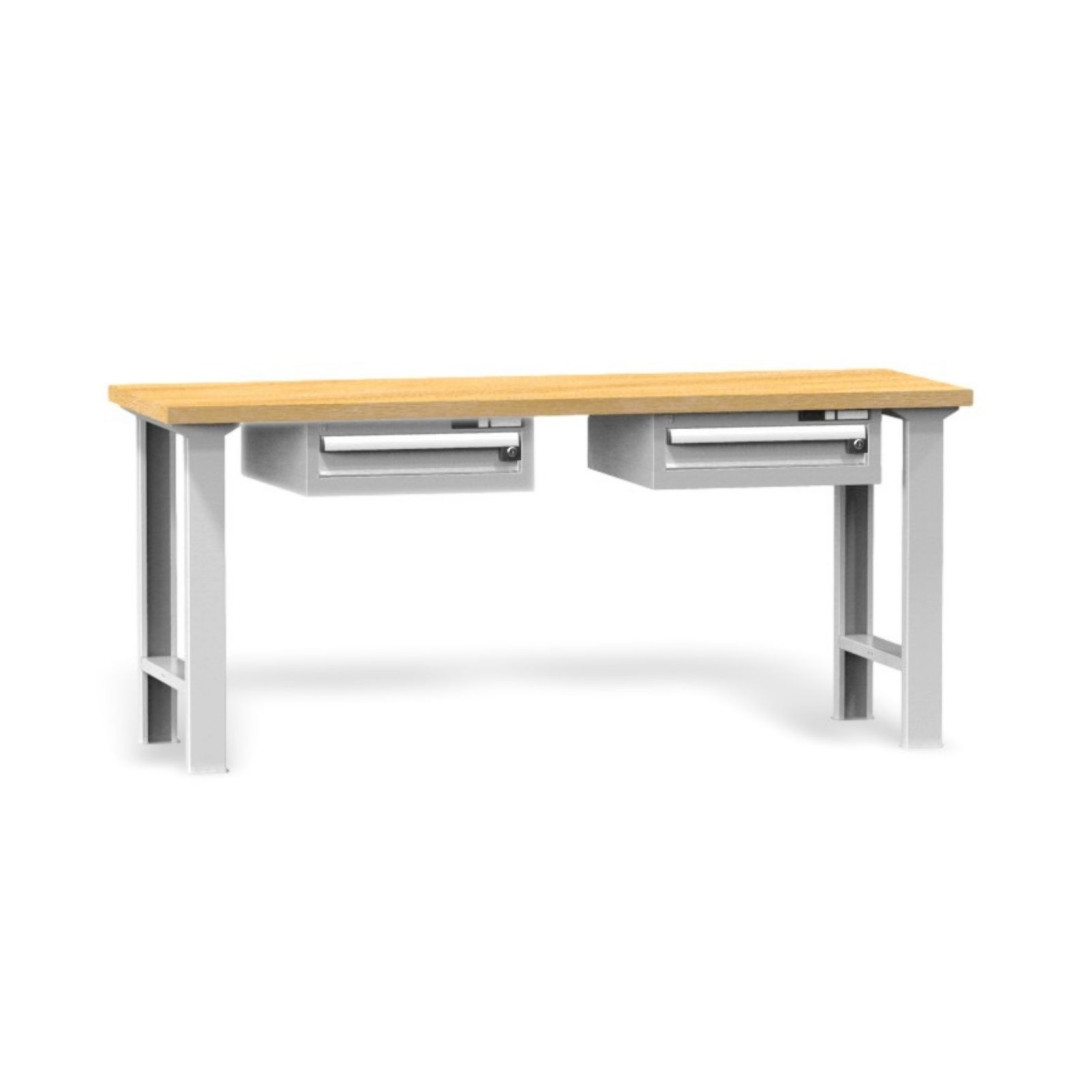 Veľkou výhodou sú výškovo nastaviteľné nohy, vďaka ktorým si stôl jednoducho prispôsobíte svojej postave aj nerovnému povrchu. Výsledkom je pohodlnejšia, ergonomickejšia práca a menej únavy počas dlhých pracovných dní. Pod pracovnou doskou sa nachádzajú dve praktické zásuvky, ktoré udržia náradie prehľadne usporiadané a vždy po ruke. S dĺžkou 2000 mm ponúka stôl dostatok priestoru aj pre väčšie projekty, pričom si zachováva čistý, jednoduchý a nadčasový vzhľad.